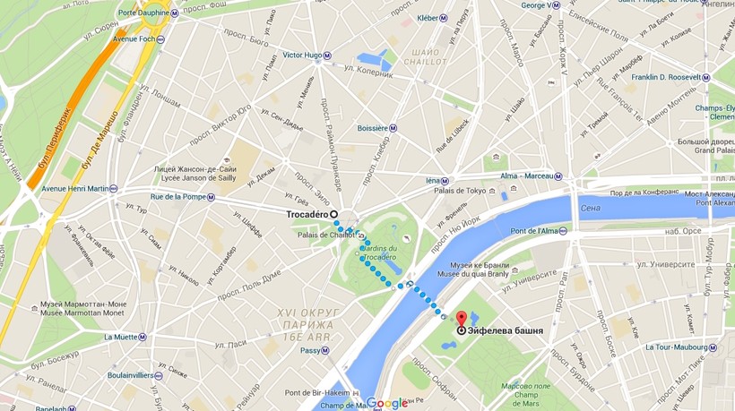 Станций метро возле большой пастушки несколько: «Пасси» («Passy»), «Шан дё Марс – Тур Эфель» («Champs de Mars – Tour Eiffel»), «Бир-Акэн» («Bir-Hakeim»), которая названа в честь сражения французов с войсками гитлеровского генерала Роммеля в мае-июне 1942 года в Ливии. Однако я очень рекомендую вам доехать до станции «Трокадеро» («Trocadéro») – она на снимке вверху. Отсюда не кратчайший, но красивейший пеший путь к Эйфелевой башне.