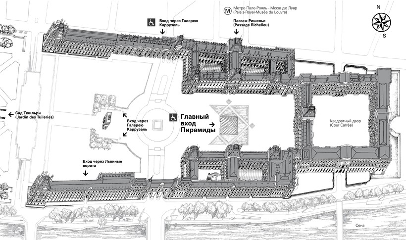А он уже совсем рядом – от Нового моста налево, затем несколько шагов по набережной Лувра, переходящей в набережную Франсуа Миттерана, и вот уже перед нами Квадратный двор (le Cour Carée) музея. Двигаясь дальше по набережной, можно войти во двор Лувра через Львиные ворота, а можно обойти дворец справа и попасть сюда же с улицы Риволи – самой роскошной и дорогой улицы не только Парижа, но и, пожалуй, Европы – через пассаж Ришелье или через галерею Каррузель.