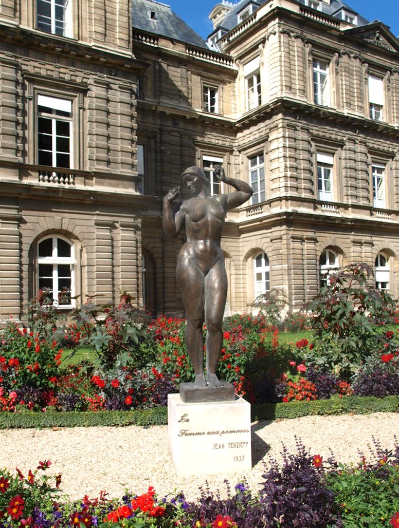 Давайте же пройдем по парку. Встав лицом к сенату, двинемся по часовой стрелке зеленого циферблата Люксембургского сада. Далеко идти не придется. Тут же рядом с Люксембургским дворцом мы увидим скульптуру «Женщина с яблоками». Ее автор – Жан Терзиефф. Вообще-то, он выходец из России, точнее из Кабарды, и зовут его Авенир Чемерзин. А его сын Лоран Терзиефф стал известным французским актером.