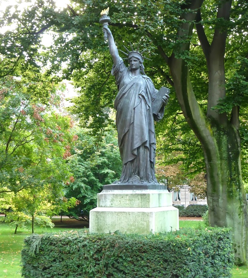 А вот и статуя «Свобода, освещающая мир» работы Фредерика Огюста Бартольди (Frédéric Auguste Bartholdi). Высотой она всего два метра. В Нью-Йорк французы отправили ее 30-тонную 46-метровую «сестру» – в подарок американцам к 100-летию США (подробнее об американской Lady Liberty вы можете прочитать здесь). Но на всякий случай оставили в Париже целых четыре копии: здесь – в Люксембургском саду, а еще – на Лебедином острове посреди Сены, в Музее искусств и ремесел и, наконец, на барже, пришвартованной рядом с Эйфелевой башней у правого берега Сены.
