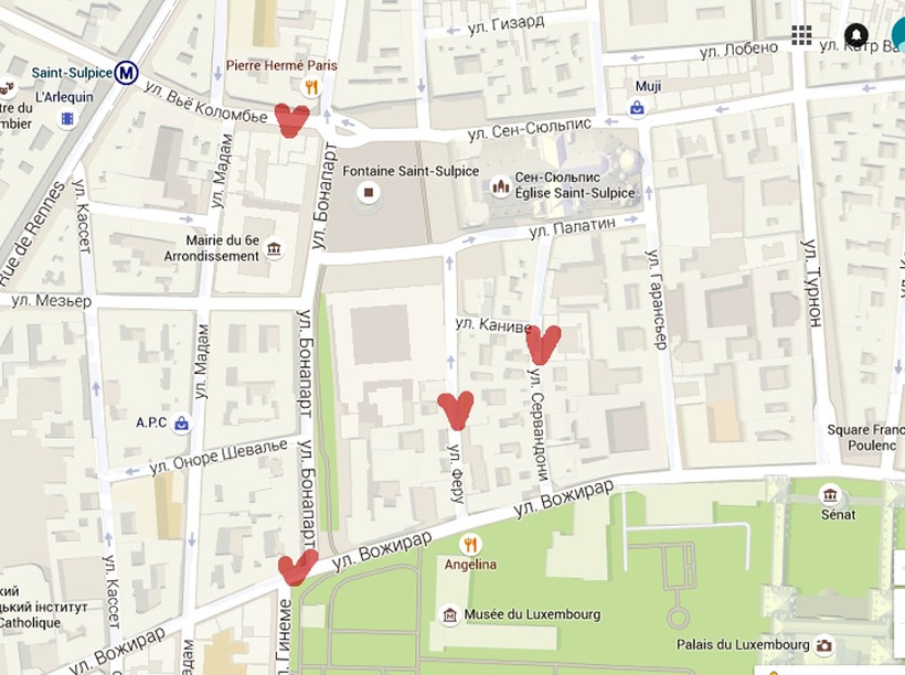 На север от Люксембургского сада, хотя и не сказать, чтобы рядом, есть станции метро «Сен-Сюльпис» (Saint-Sulpice – названа по расположенной рядом церкви Святого Сульпиция) и «Мабийон» (Mabillon - в честь ученого и монаха-бенедиктинца Жана Мабильона).