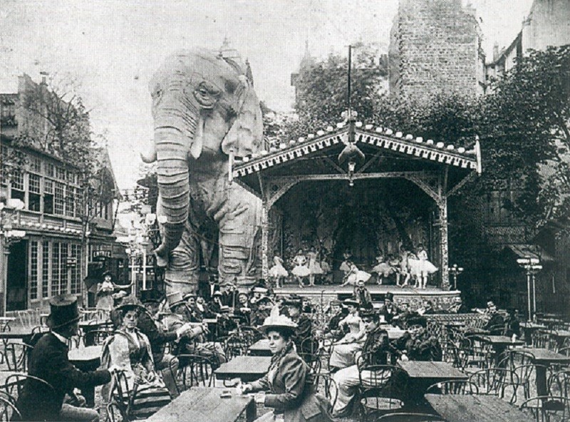 Холм Монмартр тогда приютил в своих окрестностях не один злачный дом, а также множество мюзик-холлов и кабаре, где отъявленные хулиганы были завсегдатаями, а доступные и «легкие» девушки не отличались принципиальностью. Это было место, где жизнь била ключом. Именно здесь два владельца холла Олимпия, Жозеф Оллер и Шарль Зидлер, открывают «Красную мельницу» (в переводе с франц. – прим. автора). Они задумывали Мулен Руж как революцию среди кабаре: гигантская танцплощадка, флаги, орифламмы, маленькая сцена, зеркала везде и даже гипсовый слон во дворе (приобретенный владельцами заведения на Всемирной выставке в Париже в 1889 году). В чреве этой гигантской фигуры располагалось арабское кафе, откуда также можно было наслаждаться спектаклем. Этот слон, что господствовал в глубине сада, был своего рода визитной карточкой.