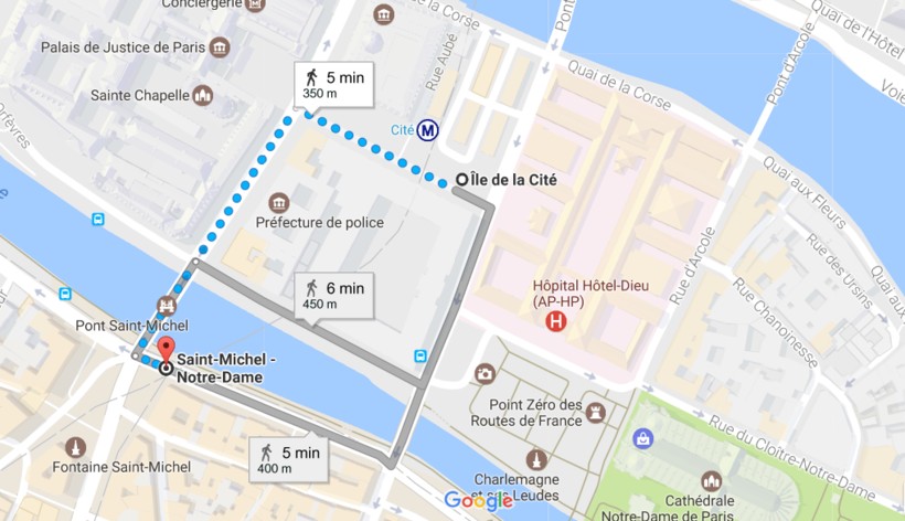 Другая близкая станция – это Saint-Michel-Notre-Dame (линия 4): она находится с противоположной стороны от острова, у моста Сен-Мишель. Она предшествует Cité.