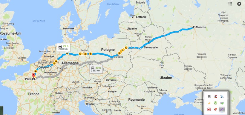 Из Москвы ходит поезд 23/24, следующий через Смоленск, Минск, Брест, Варшаву, Познань, Франкфурт, Берлин, Карлсруэ, Страсбург. Конечная точка прибытия — Париж, Восточный вокзал (Gare de l’Est). Из Москвы поезд отходит с Белорусского вокзала.