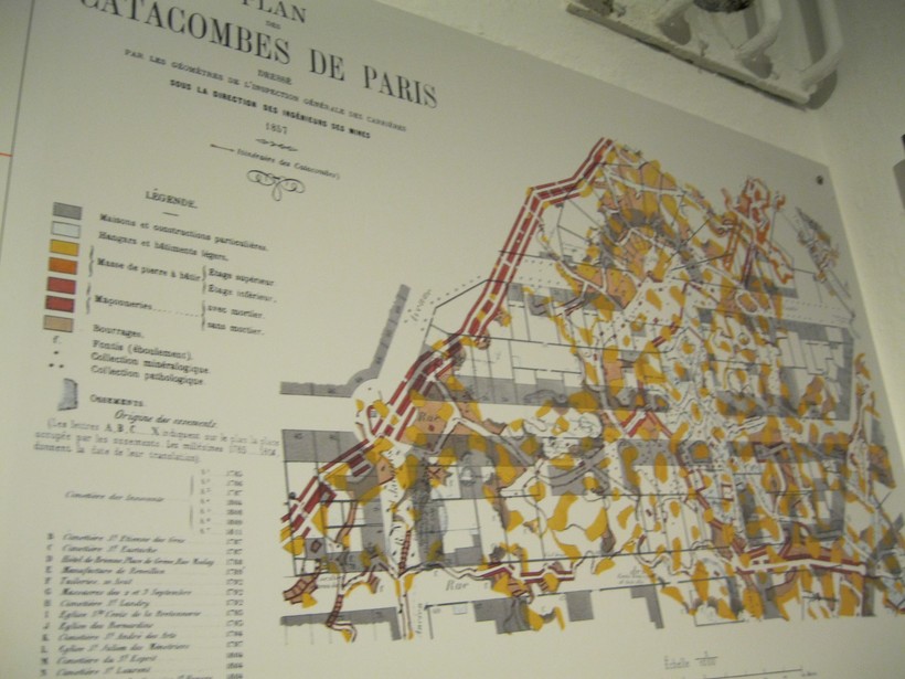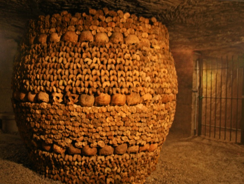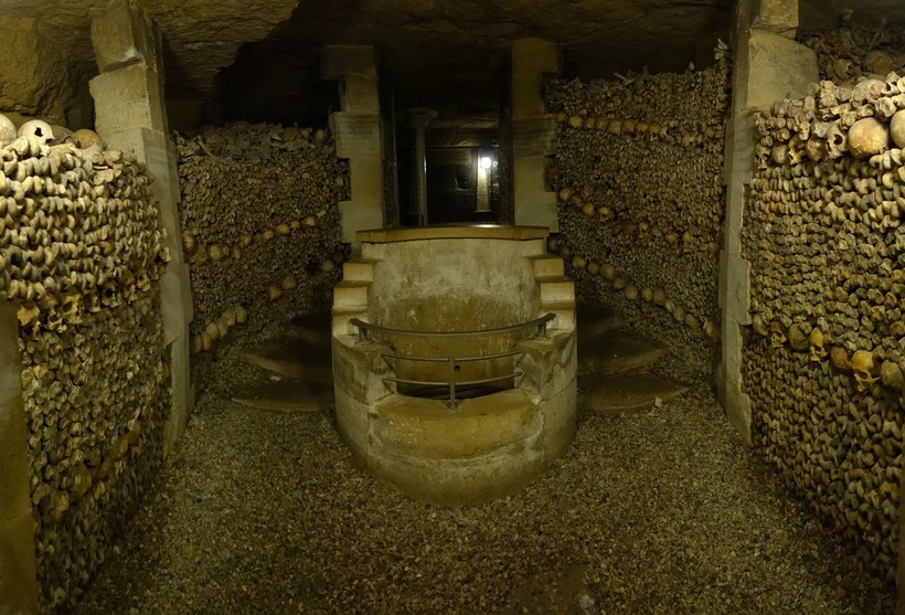 Кости и черепа выложены вдоль стен, при этом образуя своеобразный и жуткий рисунок. Черепа выкладывали в линию под и над костями. На них же укреплены таблички, на которых указано, с какого кладбища они были перенесены. Кстати, где-то среди этих костей лежат останки и знаменитых деятелей Франции: Робеспьера, Дантона, Кольбера, Рабле и т. д.