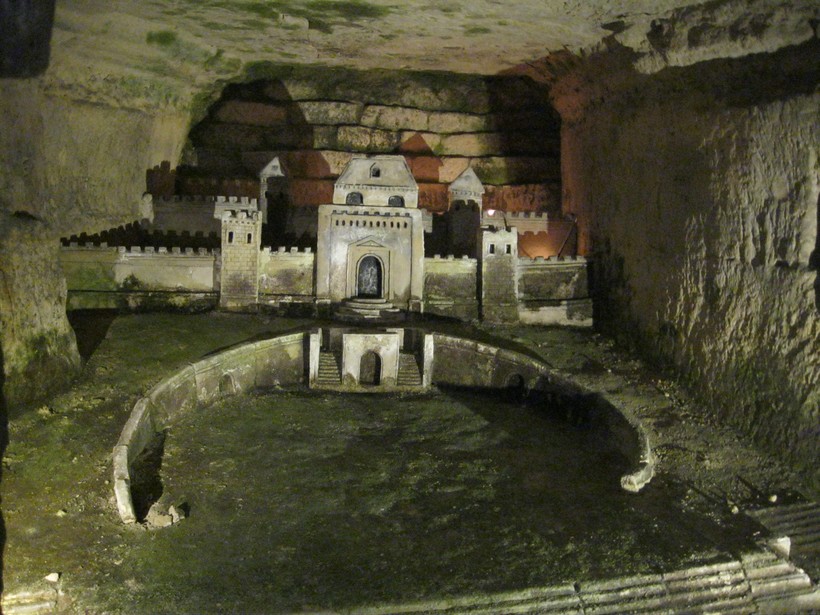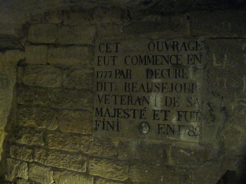 Тут нам показали скульптуры в камне, выполненные одним из рабочих каменломен Дэкюром. Будучи солдатом на службе у кардинала Ришелье, он поступил на службу в каменоломни, где стал выполнять эти скульптуры. Какова была его цель при их выполнении —неизвестно. Рядом прикреплена табличка, на которой по-французски указана вся эта информация. Кстати, умер Дэкюр здесь же, от обвала камеломен, стремясь усовершенствовать свое творение.