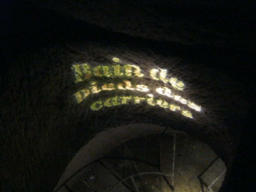 Проходя дальше по галереям, мы увидели то, что, как мы подумали, было гробницей. Но на самом деле это что-то вроде лже-гробницы, призванной поддерживать своды каменоломен. Установлена она в честь прОклятого поэта Николя Жильбера. Его стихи выгравированы на ней.