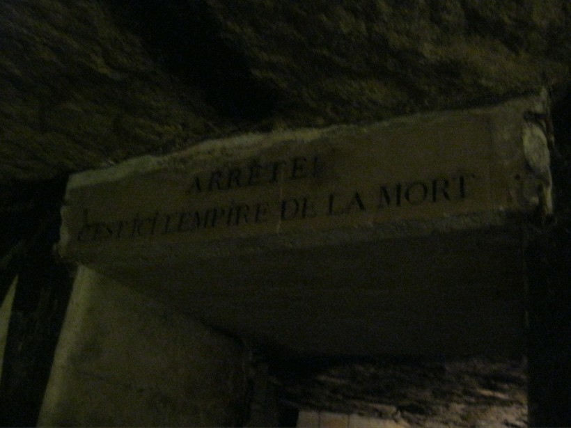 «Остановись! Здесь начинается царство мертвых,» — такая надпись значится сверху, при входе в оссуарий. Эта цитата принадлежит поэту Жаку Делилю. Далее, в самом оссуарии, мы увидели множество высказываний и отрывков из произведений французских поэтов и писателей о смерти и бренности жизни.