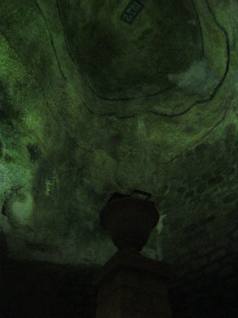 После мы попали в еще одно мрачноватое место (Хотя казалось бы, куда уж мрачнее?). В небольшой зале на каменном столбе стоит чаша в античной форме. Как вы думаете, для чего она была нужна? Как нам рассказали, ее использовали для сжигания смолы и улучшения вентилляции воздуха внутри каменоломен. Дело в том, что от костей распространялся ужасный запах, и рабочим не было чем дышать. Поэтому его и установили первым. Смолу также сжигали, чтобы отдать дань уважения умершим.