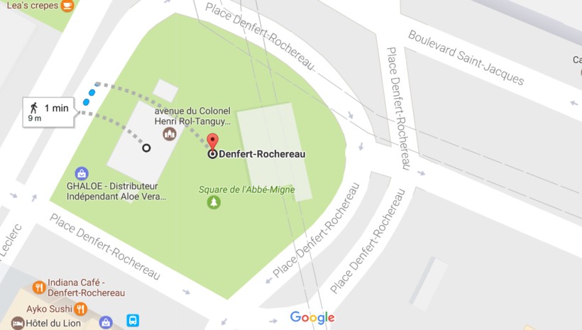 Вам нужно доехать до станции метро «Данфер-Рошро» (Denfert-Rochereau). Она находится на пересечении сразу двух веток метро: № 4 и № 6.