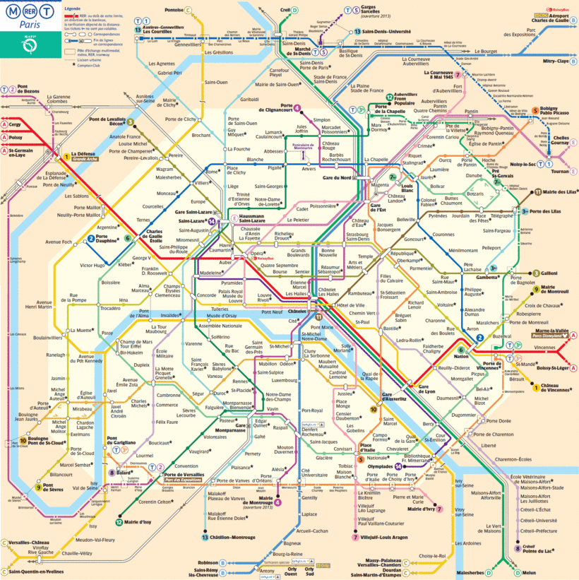 Метро Парижа состоит из 16 линий. Его схема представляет собой целую паутину из пересечения всех этих линий. Сверху накладывается еще и схема RER — Réseau Express Régional d’Ile-de-France. По-русски, это региональные электрички, соединяющие пригород с самим Парижем. RER пересекается с метро, поэтому сложно первое время привыкать к тому, что нужно переходить с метро на RER. Их 5 веток: А, В, С, D, Е, отправляющиеся до всех маленьких городков Иль-де-Франса.