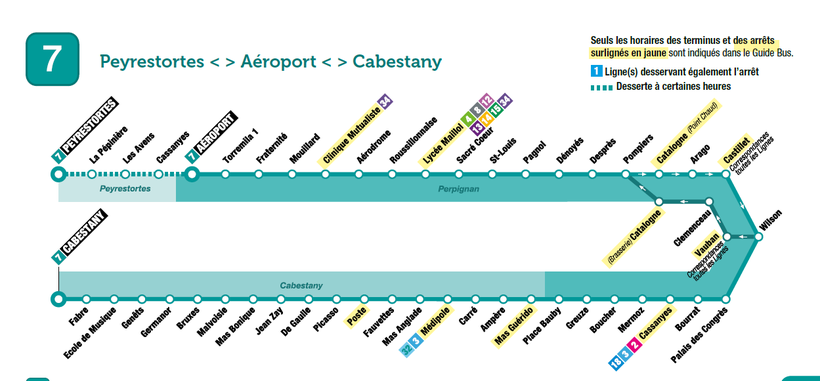 - На автобусе : остановка расположена прямо напротив здания аэропорта (между въездом и выездом автомобильной парковки). Остановка обозначена только желтой зигзагообразной линей на дороге, но найти её не составит труда. Отсюда до центра города отъезжает автобус линии 7 (с интервалом 30 минут с 7.00 до 22.00). Выйти нужно на остановке "Castillet" или "Vauban" (отсюда, к тому же, можно перейти к другим автобусным линиям).