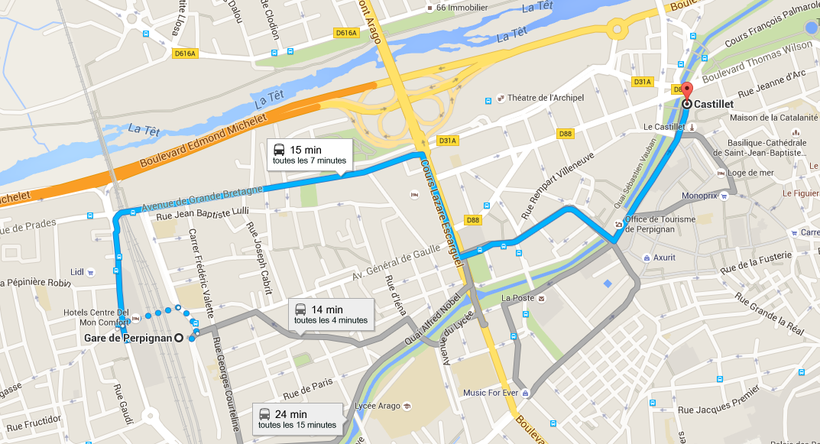 - на автобусе: линия 6 от остановки Gare SNCF до Castillet