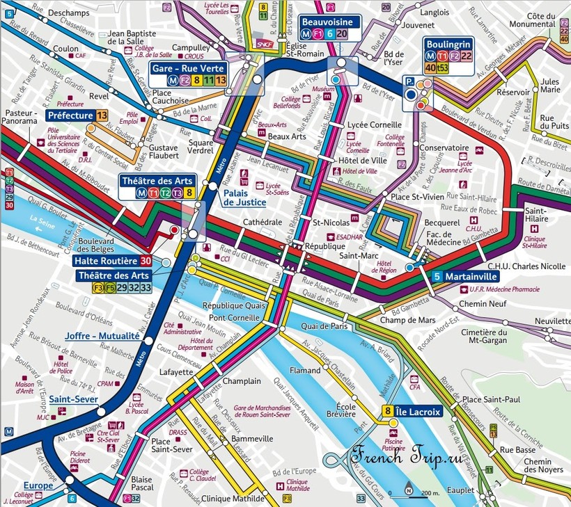 Плюс ко всему вы не обнаружите турникетов и контролеров. Всё, так сказать, на совесть. Станций немного, всего 38: 18 на первой ветке и 20 на второй. Находятся они в непосредственной близости друг от друга. Удобно пользоваться этим транспортом в случае, если он наиболее удобен в доставке вас до интересующей точки на карте Руана.
