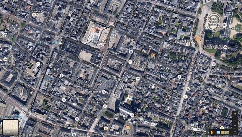Кстати, автобус останавливается в Руане у моста Жанны Д'Арк в непосредственной близости от Руанского католического собора. Главный храм города должен служить для вас ориентиром, поскольку отъезжать вы будете с этого же места.