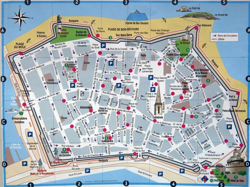 - Крепостная стена (Les remparts de Saint Malo). Крепостная стена, служившая защитой от внешних врагов в Средние века, расположена по всему периметру города. Сегодня это лучшая смотровая площадка во время прилива.