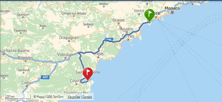 Машиной доберетесь ориентировочно за 1 час 30 мин, можно и быстрее: все зависит от пробок. Покидая аэропорт, придерживайтесь направления А8 (синий знак), Sophia-Antipolis, Antibes, Cannes. Следуйте за синими указателями, во Франции они показывают направления по автобанам. Покинуть трассу нужно на выходе №36 Le Muy, а затем следуйте за зелёными указателями Saint Tropez.