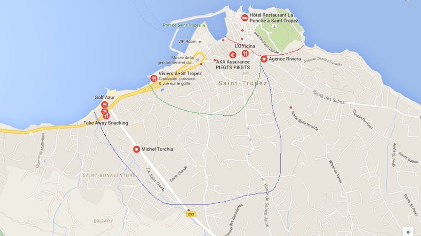 Сам по себе Сен-Тропе – городок небольшой, а исторический центр ещё меньше. В центре города сосредоточены рестораны, бары, ночные клубы и магазины, именно поэтому не стоит здесь снимать квартиру для вашего отдыха. Оживлённая ночная жизнь летних месяцев (особенно в июле и в августе) может омрачить отпуск. Такие районы как, Порт (Le Port), Цитадель (La Citadelle), Старый город (La Vielle Ville), Гаронна (La Garonne) конечно очень живописны и престижны, но неидеальны для проживания (на карте я их отделила красной линией).