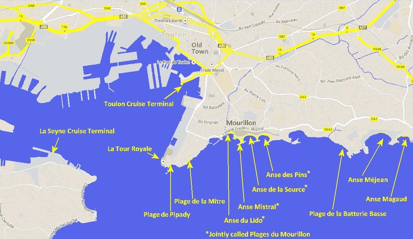 - Corniche du Mourillon Beach — пляж, который находится в одноименном районе. Он был построен в 1970-ом году мэрией Тулона специально для туристов и местных жителей. Песок сюда привезен исключительно мелкий, и благодаря ему прибрежная полоса воды становится бирюзовой. Заход в море очень ровный, удобный, идеален для детей. Находятся пляжи этой линейки (а всего их четыре в четырех бухтах) на юге города, в курортном районе, возле Форта Святого Луиса. Вход на пляж бесплатный, на некоторых есть шезлонги от кафе и баров. Этот пляж может быть единственным местом вашего отдыха, если вы остановились в Тулоне всего на неделю или две. Он достаточно легко доступен из центра и главного курортного района, чтобы стать вашим любимым.