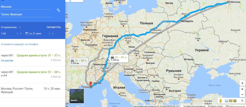 Внизу мы составили два маршрута для Москвы и Санкт-Петербурга. Простые варианты идут через Варшаву, Врослав, Дрезден, Нюрнберг, Страсбург, Лион и Марсель. Легко можно заехать по пути в Прагу, Цюрих и Женеву. В маршруте через Италию — в Геную и Милан. Выбирайте тот, что вам больше по вкусу!