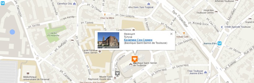 Как я и писала выше, Базилика Сен-Сернен находится в центре Тулузы, но надо знать несколько предостережений по маршруту: улиц, на которых туристам лучше не бывать. Рядом с церковью находится целый квартал, который желательно обойти стороной, несмотря на экономию времени по пути к живописному месту под названием Jardin Japonais (Японский садик). Вот перечень улиц и карта,на которой я отметила тот маршрут, которым ходить не стоит: