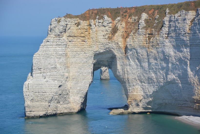 - Алебастровые скалы. Визитная карточка Нормандии — знаменитые скалы в Этрета. Они поражают своей необычной формой и цветом. Их высота достигает 120 метров. Самая фотографируемая скала — La falaise d'Aval (в переводе «слон, спустивший хобот в море»). Именно ее стремятся разглядеть поближе все туристы. Она находится по левую сторону от центральной набережной. Рядом с этой скалой находится другая, не менее популярная — L'Aiguille Creuse (в пер. «обелиск»), в которой по легенде хранятся королевские сокровища. Если свернуть вправо от набережной, то можно оказаться по другую сторону города и получить потрясающий обзор на город и знаменитые скалы. После увиденного я еще долго не мог прийти в себя, настолько удивительно красиво было все вокруг.