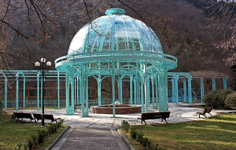 - Городской парк Боржоми протянулся вдоль речки Боржомки и расположился у подножья горы. Он находится за коваными воротами, так что за вход придется заплатить около 0,5 USD/1 GEL. О том, что парк платный, я узнала раз на седьмой, поэтому и вы можете попробовать спокойно пройти незамеченными. Внутри стоит зеленоватая кованая беседка-павильон (архитектор – тот самый Гюстав Эйфель), где можно попить знаменитой воды. Разумеется, она не такая, как в фирменных бутылках, а настоящая, природная, серная, а потому невкусная. Зато полезная. Если хотите набрать воды с собой, берите свою тару. До 2005 года парк находился в романтическом запустении, а сейчас там есть довольно живописный водопад, золотая скульптура Прометея под ним (ее привезли из Тбилиси), крытый бассейн с обычной водой (местные любят купаться и загорать там) и детские аттракционы;