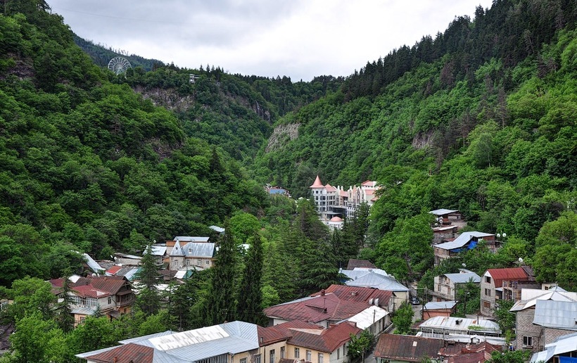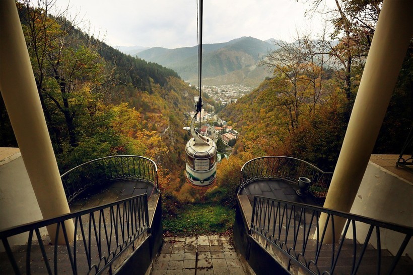 - Канатная дорога, нижняя станция которой находится в Городском парке Боржоми. Ретро-кабинка с открывающими окнами добирается до верхней точки горы (1000 метров над уровнем моря) за пять минут. Поездка в одну сторону стоит 1,5 USD/3 GEL. Наверху есть небольшое кафе, колесо обозрения и смотровая площадка, с которой вы увидите ущелье и затерянный в нем Боржоми. Спускаться я предпочитаю пешком по очень красивой дороге среди хвойных деревьев. Единственная проблема — почти все водители будут останавливаться, чтобы подвезти вас, и каждому придется объяснять, что вы просто хотите прогуляться. Ну или все-таки поддаться уговорам и доехать до города на авто.