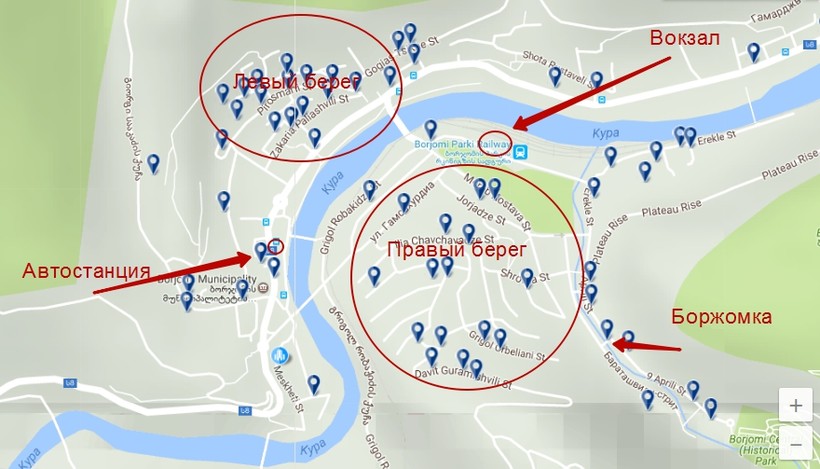 - На левом берегу Куры расположена основная улица города, она носит имя Шота Руставели. На ней много аптек и несколько продуктовых магазинов и - самое главное - автостанция. Если подняться наверх — там маленькие улочки Пиросмани, Святой Нино и Гогиас Цихе (что бы это ни обозначало). Они хитро переплетаются, резко обмениваясь названиями в местах пересечений. На этих улицах расположена основная часть гостевых домов Боржоми.