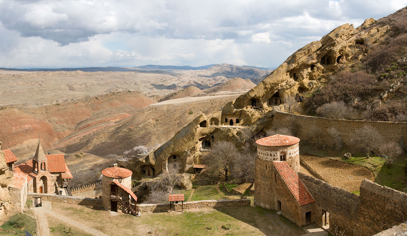 Поражают пустынные окрестности, где есть только степь и жаркое солнце, 20 монастырей, высеченные в мягких светлых песчаных скалах, сотни келий, тоннели, переходы, башенки. Все это великолепие растянулось на 25 километров вдоль грузинско-азербайджанской границы! Причем часть монастыря находится уже в Азербайджане, и вы можете запросто поболтать с тамошними пограничниками. Кстати, спор об этой территории идет между Грузией и Азербайджаном с 1991 года. К счастью, он довольно вялый.