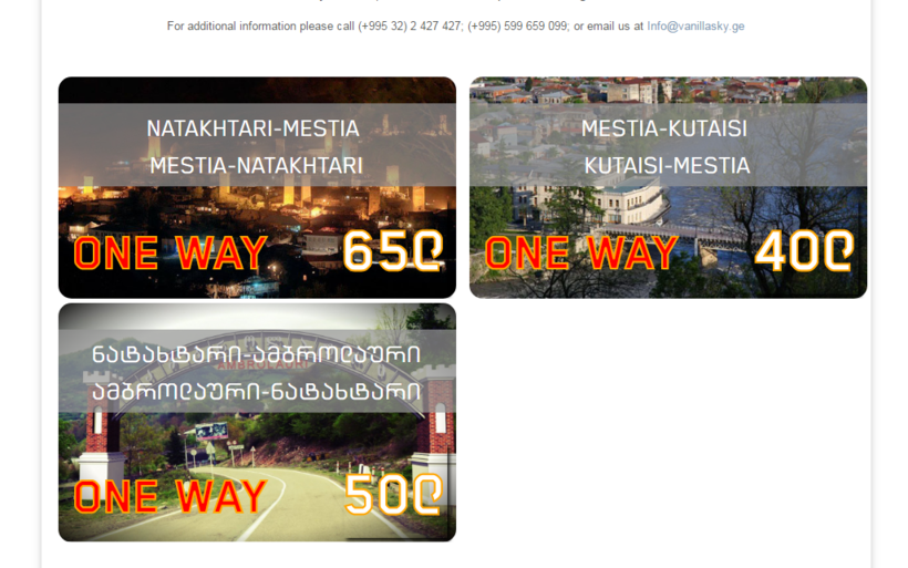Билет в один конец из Тбилиси стоит 25.26 EUR (65 GEL). Забронировать билет можно по телефону +995 2 427 427 или мобильный +995 599 65 90 99 или написать письмо info@vanillasky.ge