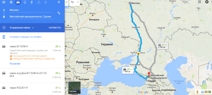 Как видите, при самых скромных подсчётах, на бензин вы потратите около 7000 RUB. Если у вас два водителя или вы путешествуете большой компанией, тогда поездка Москва – Местия на автомобиле выйдет вам дешевле, чем поезд, самолёт и даже автобус. Если вы едете один, приготовьтесь к долгому путешествию с ночёвкой.