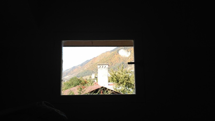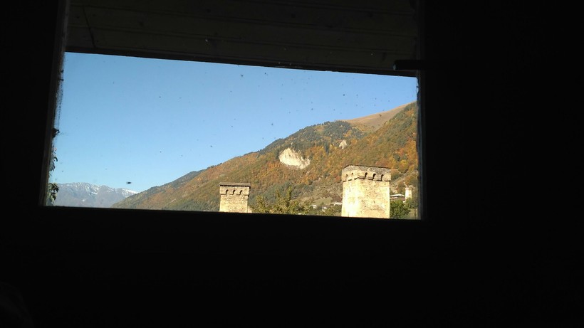 На фото ниже вид из окна Сванской башни, в которой мы с мужем жили. Это вполне себе современный дом с пластиковыми окнами в Местии, наверху которого сохранилась настоящая Сванская башня. Хозяйка — старенькая сгорбленная бабушка, настоящая сванка, по-русски почти не говорила, но была очень дружелюбна. По-русски говорил её сын, который предложил нам погулять по крыше башни (бесплатно), что мы с удовольствием сделали.