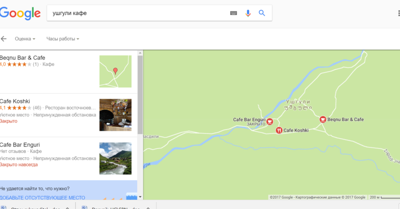 - 19:00-20:00 — поесть в одном из двух кафе, которые есть в Ушгули. (на скриншоте кафе «Кошки» закрыто, потому что время уже час ночи, а вообще работает с 8 утра до 9 вечера).