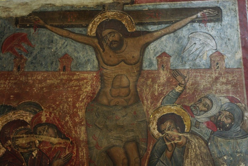 Начните осмотр храма по часовой стрелке. Первое, что бросится вам в глаза — необычная фреска, изображающая распятие. Не уходите сразу и присмотритесь к ней чуть внимательней: по обеим сторонам от Христа будто бы парят две летающие тарелки. Бытовало даже мнение, что автор отобразил прилет НЛО. Историческая шутка, конечно, но все же. На самом деле это символическое изображение Солнца и Луны. Все остальные фрески собора тоже поздние, примерно XV века, в основном уже отреставрированные.