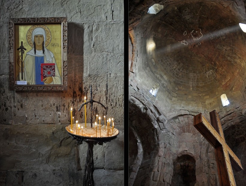 Когда мы подъезжали к монастырю, первым, что сразу бросилось в глаза, стало большое количество искусственных пещер, разбросанных по песчанику вокруг монастыря. Это самые древние постройки обители — монахи вырыли эти кельи в середине VI века сразу после прихода сюда святого Шио. К этому же времени относится и храм Святого Иоанна Крестителя — очень простая и легкая в своей конструкции церковь.
