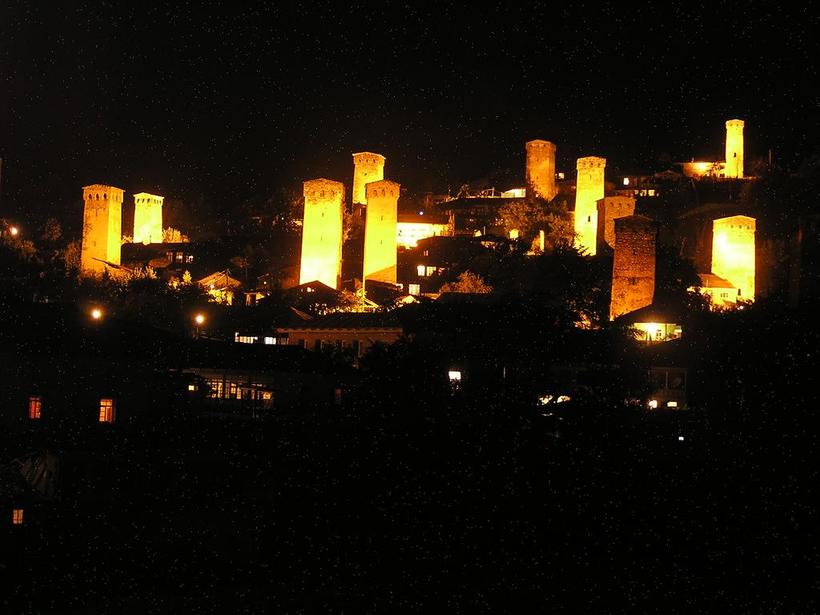 город Местиа. И причем именно в темное время суток. Когда видишь эти странные башни, подсвеченные теплым желтым светом, ощущение реальности происходящего теряется. Здорово побродить по Местии хотя бы час, чтобы прочувствовать атмосферу и понять что-то новое о ценностях нашего мира;