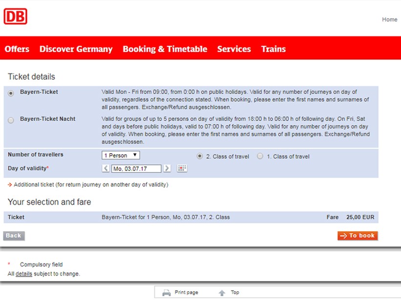 Баварский билет действует по будням с 09:00 до 03:00 текущего дня, а также его можно купить на все выходные (с субботы по воскресенье). С помощью такого билета вы можете перемещаться не только на поездах, но и на любом транспорте любого города Баварии: автобусе, трамвае, метро.