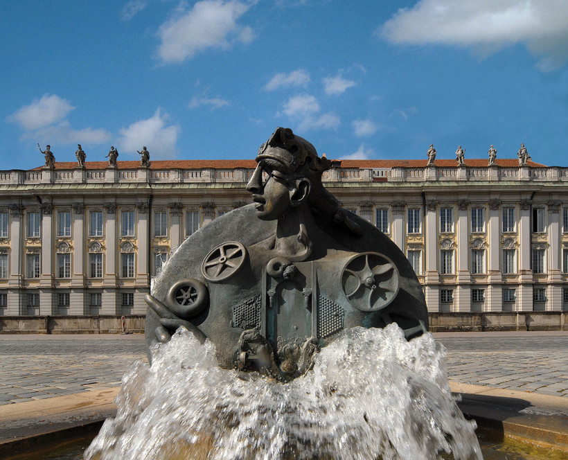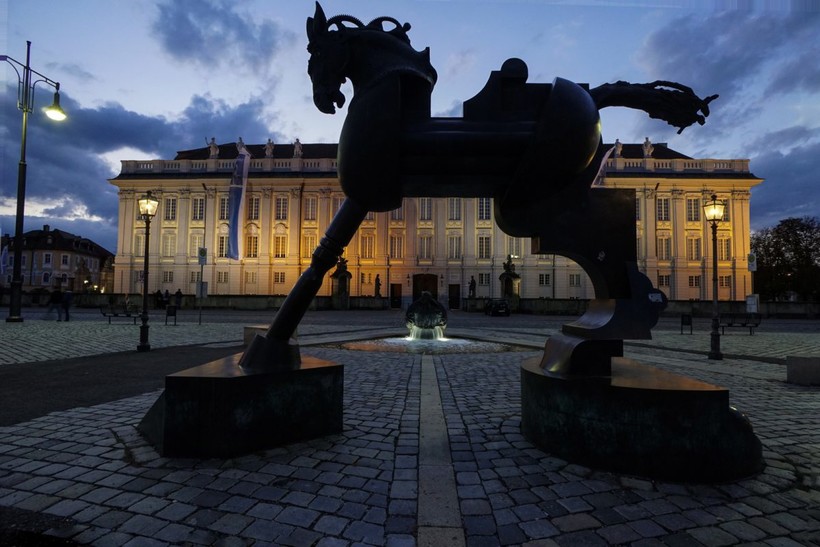 У одного из выходов из Городского парка / Schlossgarten, недалеко от кинотеатра, стоит конь-револьвер Anscavallo с безумными глазами на одной стороне морды.