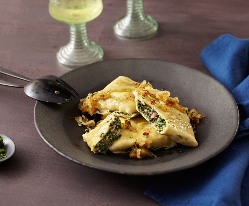 - Другое известное швабское блюдо, похожее на макароны – маульташи (дословно переводится как «съедобные корзинки»), которое похоже на запеченные итальянские тортеллини. Оно состоит из смеси фарша и овощей, завернутой в макаронное тесто. Их размер отличается в зависимости от способа приготовления: маленькие, как правило, варят в воде («Suppenmaultaschen»), в то время как более крупные жарят на сковороде либо в томатном соусе, либо с тертым сыром, либо и с тем и с другим. В ресторанах маульташи подают с местным картофельным салатом (см. ниже «Kartoffelsalat») и квашеной капустой. Как уже упоминалось, маульташи хорошо иллюстрируют культурное сходство с регионами Европы, с которыми граничит Германия, от южной границы страны до Южной Европы (Италия).