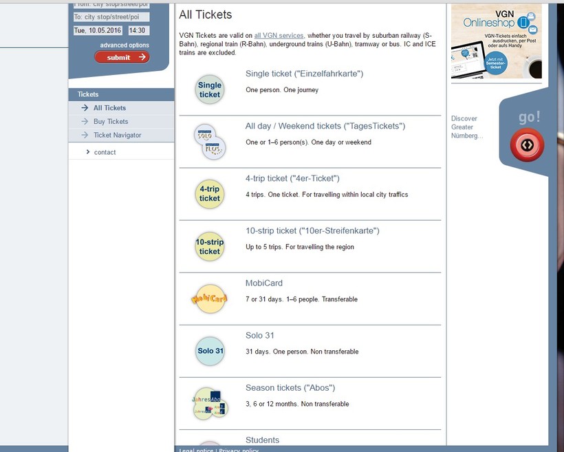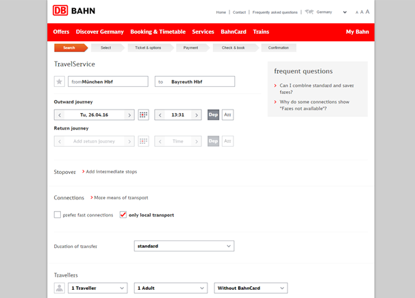 Расписание поездов, а также стоимость проезда можно узнать на англоязычной версии сайта. В целях экономии в поисковой системе ресурса нажмите иконку Further search options, выберите вместо автоматически предложенного варианта prefer fast connections иконку only local transport: для бережливых туристов это будет существенная экономия, особенно если билет приобретается в будний день.
