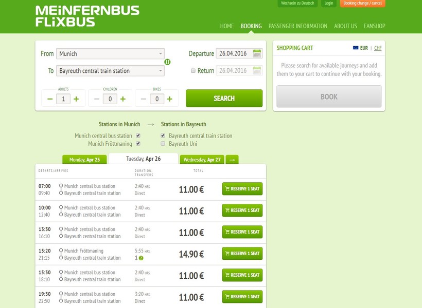 Из многих городов Германии до Байройта можно добраться на автобусе. Выгодные варианты поездки предлагает этот сервис, где можно узнать расписание автобусов и цены на то или иное направление. Пользоваться ресурсом очень просто: необходимо указать город отправления, цель и дату поездки. Система мгновенно предлагает все имеющиеся рейсы с указанием цены и времени в пути.