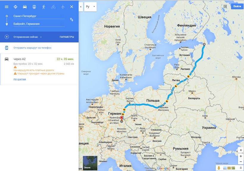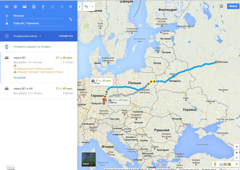 Обратите внимание, что на некоторых маршрутах могут попадаться платные участки дороги (например, М3/Смоленск и А2 в Польше).