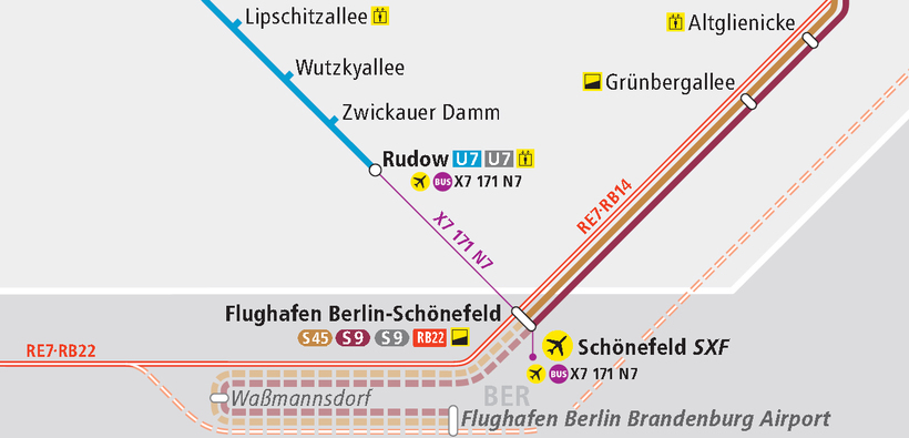Шёнефельд находится в транспортной зоне С, поэтому для поездки потребуется билет, действительный для зоны ABC или BC.
