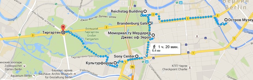 Где Рейхстаг, там и Тиргартен (Tiergarten), Бранденбургские ворота, там и Мемориал Холокосту, и Церковь Святой Марии, далее Музейный остров. По другую сторону – Потсдамер Плац – современный центр притяжения туристов, с чистого поля отстроенный в конце 90-х. Там же Сони центр и Берлинале Палас – место проведения Берлинского кинофестиваля и прочих международных кинопремьер. За ним – филармония и комплекс галерей "Культурфорум".