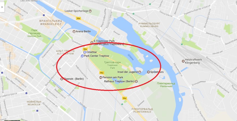 Добраться до парка можно на городской электричке S7 и S9 до остановки «Ostkreuz», потом пересесть на кольцевую линию до остановки «Treptower Park».