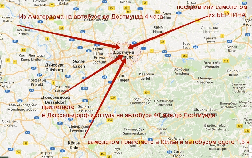 Мы ездили прямым поездом из Берлина и Гамбурга в Дортмунд, идёт он около 3 часов, стоит билет от 20–30 EUR при покупке заранее и порядка 60–70 EUR за неделю до отъезда. До этих городов придётся летать, но оба города имеют крупные аэропорты, прямое авиасообщение со многими странами. Авиабилет Москва – Берлин – Москва обойдётся в дни распродаж вам в цену около 100 USD, как и билет в Дюссельдорф.