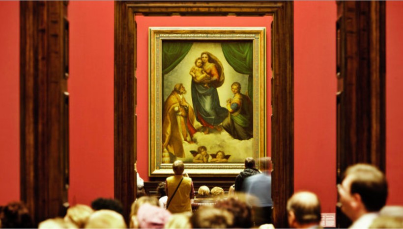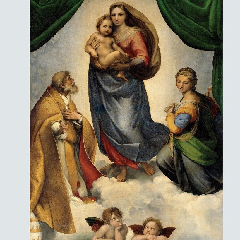 «Сикстинская Мадонна» Рафаэля Санти – полотно, прославившее эту галерею. Эта картина считается одной из самых выдающихся работ мастера. Святая изображена на картине в полный рост с Иисусом на руках, она стоит на небесах и будто делает шаг вперед, навстречу зрителю. Её взгляд устремлен прямо на вас, так что невозможно не только пройти мимо, но и отвести взгляд от этого полотна. На картине также изображены папа Сикст II и Святая Варвара. Полотно ярко отражает сложившиеся к началу века традиции изображения Мадонны: фигура Святой с младенцем на руках в центре полотна, перед Христом преклоняются святые и священнослужители, при этом пространство перед ними всегда остаётся свободным, фигуры образуют треугольник. Задний план выглядит намеренно театральным. Так, на картине Рафаэля возникают шторы, подчеркивающие геометрическую точность композиции и обрамляющие сцену, отделяющие её от зрителя. На переднем плане мы видим двух младенцев-ангелов, задумчиво оперевшихся на раму картины. Они будто выглядывают из небесной мира, отделяя тем самым пространство картины от мира земного.