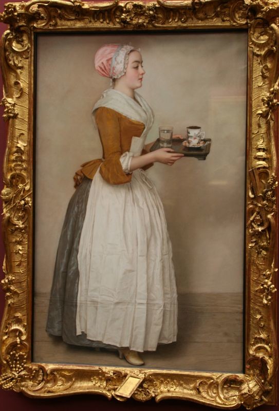 Эта картина произвела на меня намного меньшее впечатление. Относительно позднее произведение (1745 год), оно кажется на удивление простым и незатейливым. На холсте мы видим изображение девушки с подносом с горячим шоколадом и водой в руках. По словам критиков, перед нами не портрет, а жанровую сценку, где показан эпизод из рабочих будней обычной небогатой девушки. Мне картина показалась слишком простой, а потому немного скучной, хотя многих именно эта незатейливость сюжета покоряет. Я же однозначно могу отметить только высокое мастерство Лиотара – изображение отличается почти фотографической точностью.