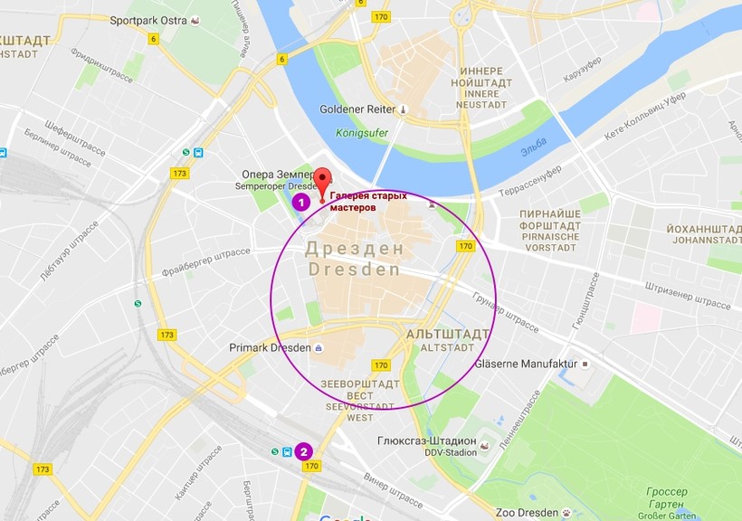 Дворцовый комплекс Цвингер, где разместилась галерея, находится в историческом центре Дрездена, в пешей доступности от всех достопримечательностей города. От центрального городского вокзала сюда также можно добраться пешком всего за 20 минут или на общественном транспорте до остановки Dresden Postplatz (от центрального вокзала сюда идут автобусы 333 и 360 или трамвай номер 11). На карте ниже музей обозначен цифрой 1, вокзал – цифрой 2, а Старый город обведен в круг: